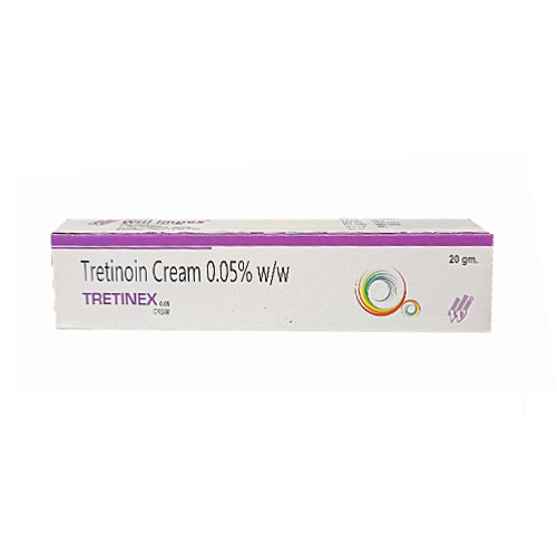 Tretinex Cream which contains tretinoin (a vitamin A derivative), tackles skin conditions such as acne by increasing skin cell turnover, lowering sebum production, and reducing wrinkles and symptoms of age.